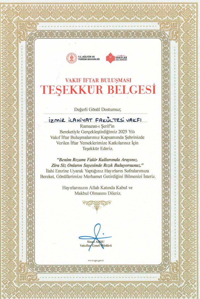 2025 Yılı Ramazan Ayında İzmir’de tertiplenen iftar buluşmalarına yaptığımız katkı dolayısıyla Vakıflar Genel Müdürlüğü tarafından Vakfımıza verilen teşekkür belgesi.